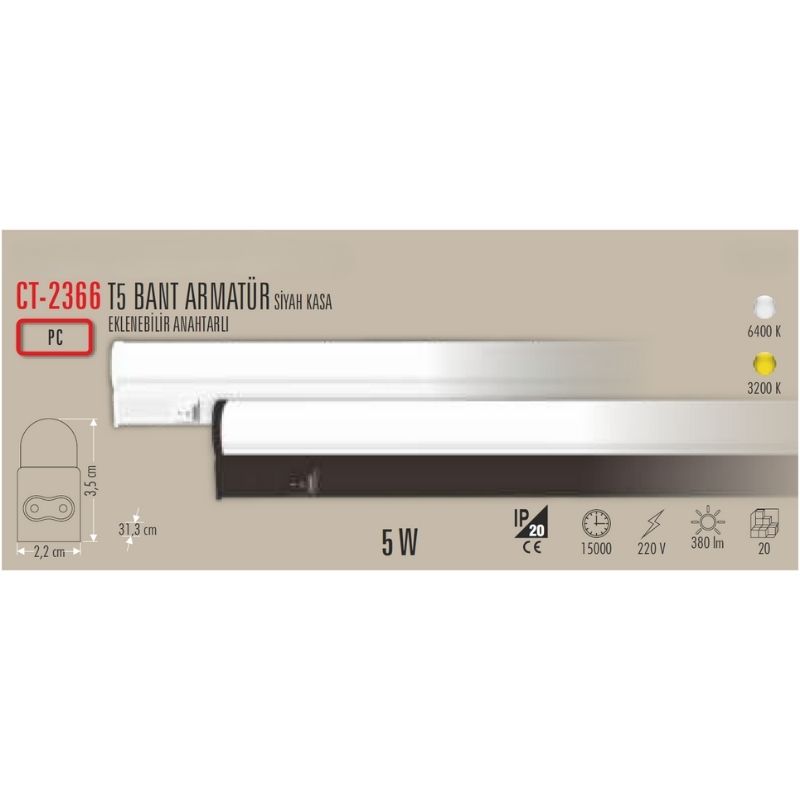 Cata CT-2366 5W T5 Ledli Bant Armatür Siyah Kasa / Beyaz, iç mekânlarda fonksiyonel, ekonomik ve estetik aydınlatma arayanlar için ideal bir LED bant armatür çözümüdür.