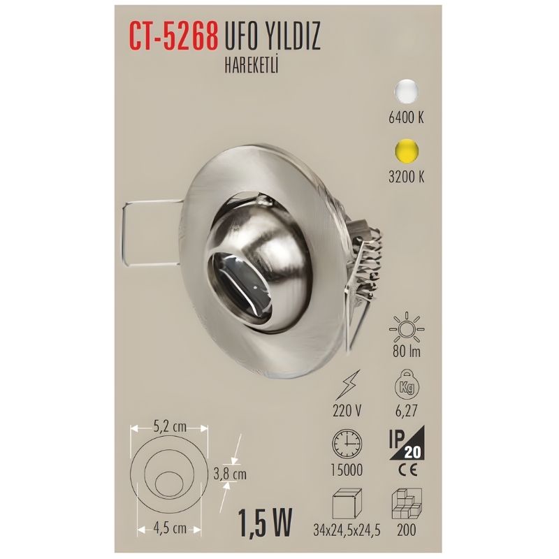 CT-5268 UFO Yıldız LED Spot, 1,5 W LED gücü ve zarif saten tasarımıyla hem dekoratif hem işlevsel bir aydınlatma sunar. 6500K, 4000K ve 3200K renk sıcaklığı seçenekleri sayesinde ortama uygun ambiyans yaratılabilir. Hareketli başlığı sayesinde ışığı dilediğiniz yöne kolayca yönlendirebilirsiniz. Cata yüksek performanslı yıldız spot aydınlatma armatürü, geniş bir sıcaklık aralığında (-40 °C ~ +60 °C) çalışabilme yeteneği ile olağanüstü dayanıklılık sunar. Dim edilemez özellikte olup, sürekli parlak ve kararlı ışık sağlar. 15.000 saatlik uzun ömrü sayesinde bakım gereksinimlerini minimize eder.
