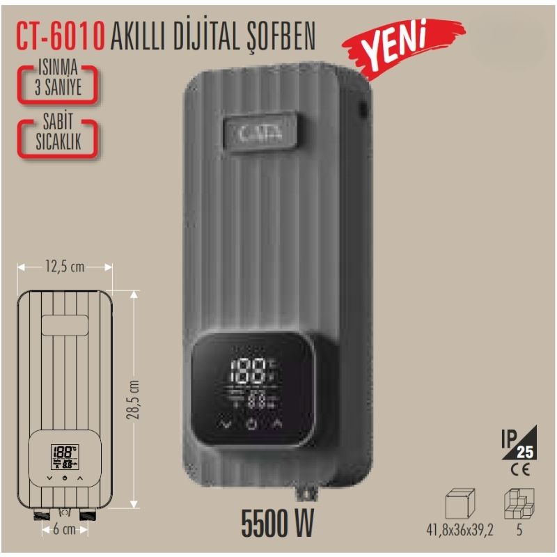 Cata CT-6010, kombi veya su depolama tankı gerektirmeden suyu anında ısıtan bir akıllı dijital şofbendir. Duşta veya lavaboda ihtiyacınız olan anda, beklemeden sıcak suya kavuşmanızı sağlar.