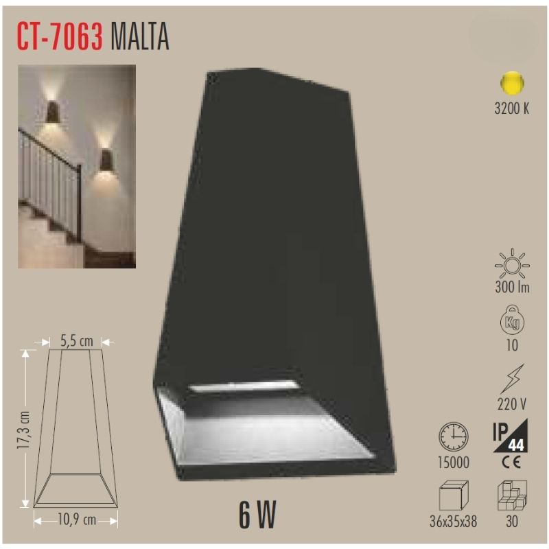 Cata CT-7063 Malta Dış Mekan LED Aplik (2x3W), dış cephe aydınlatmalarında şık tasarımı, dengeli ışık dağılımı ve enerji tasarruflu yapısı ile uzun ömürlü ve dekoratif bir aydınlatma çözümü sunar.